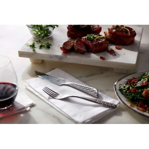 • Extrémně ostré čepele: Nože jsou vybaveny jemným zoubkováním, které zaručuje čistý řez bez trhání vláken masa.